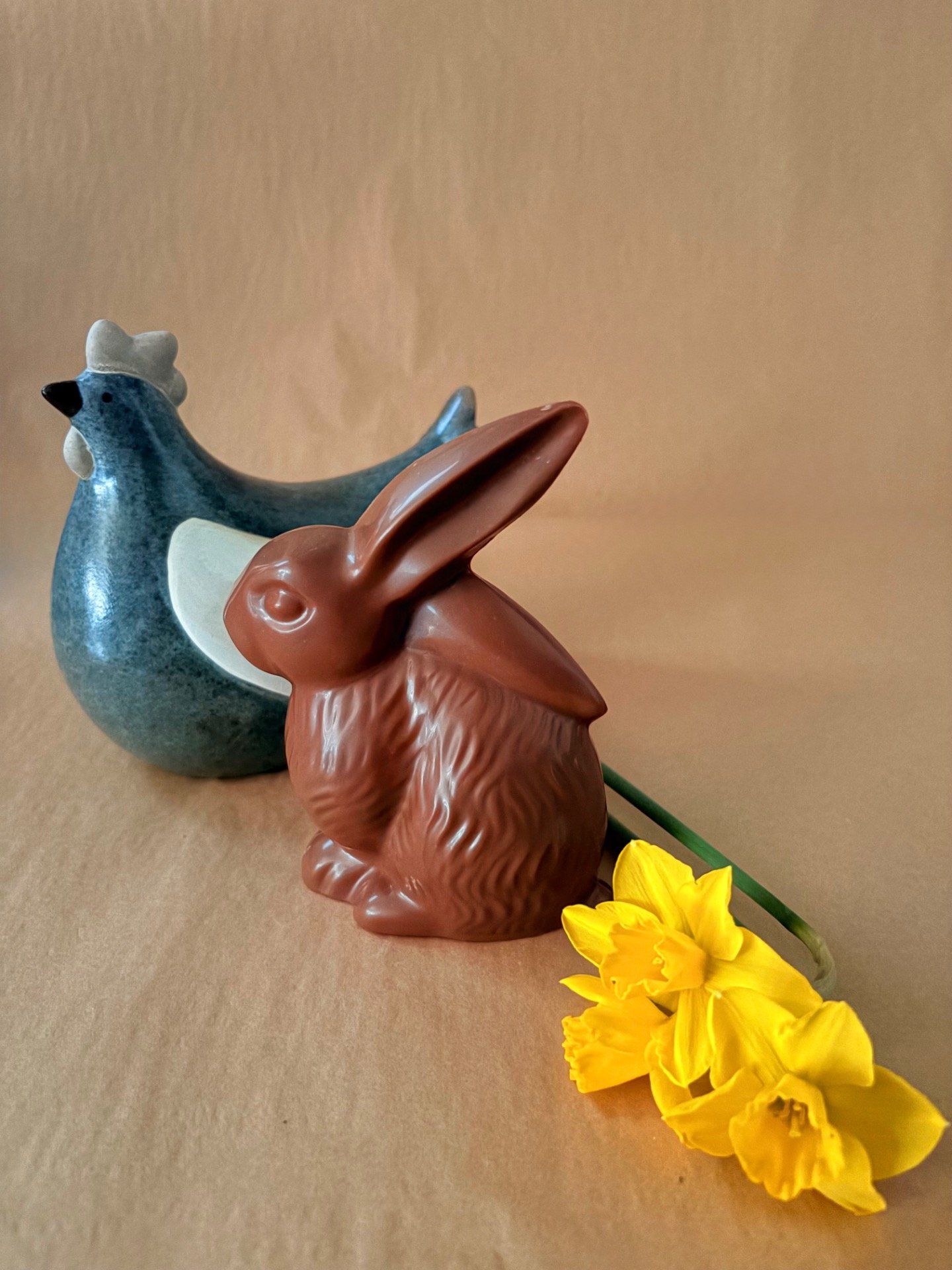 Chocolat noir 74% de Madagascar ou chocolat lait 39%, garni de fritures lait et noir, de pavés des neiges (gianduja aux éclats de meringue), et d'oeufs praliné